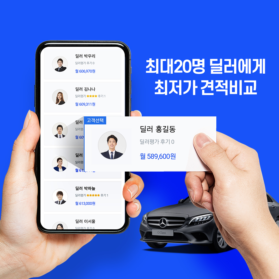 여러 딜러가 견적서를 올려주고, 나는 조건이 괜찮은 견적만 선택해서 상담을 진행합니다.